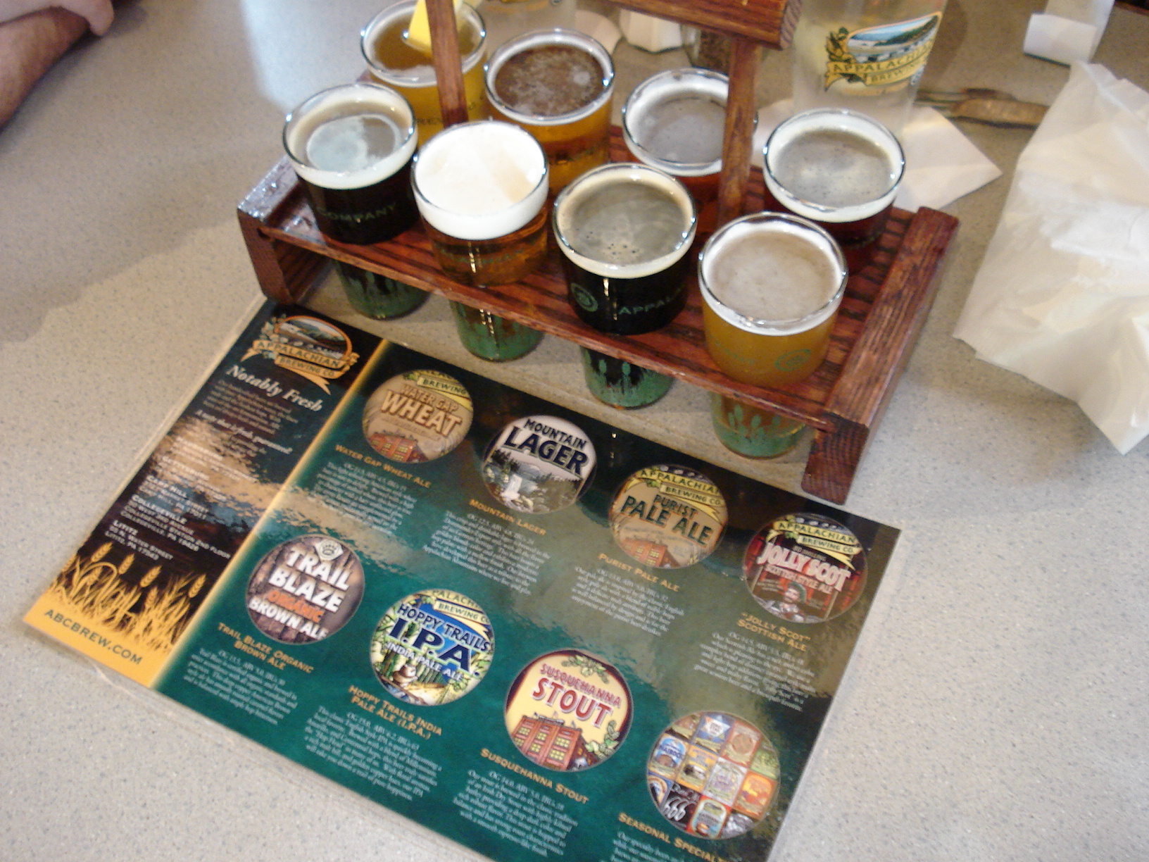 So you ask “vel, what about the BEER?” ABC has always had good beer for us. It doesn’t tend to the sweet as so many microbreweries do. As I’ve mentioned before, we like hefe weizens so we’ve always ordered that here, and it’s always been good, varying only a bit with the strength of the “banana” aroma. They don’t try as many odd brews as they once did, one notable beer only had heather in it, no hops at all. But they’ve hit a good raft of standards. The flight of samples came with the following: Water Gap Wheat, Mountain Lager, Purist Pale Ale, Trail Blaze Organic Brown Ale, Hoppy Trails Indian Pale Ale, Susquehanna Stout and their seasonal for this month, Hinterland Hefe Weizen (which might as well be another flagship since they brew it more than once a year).