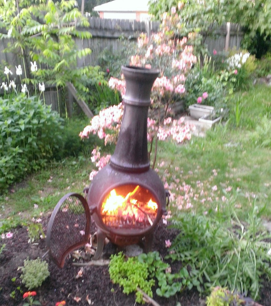 A slightly blurry photo of our very nifty chimenea, cast iron outdoor fireplace. We were enjoying a little homemade mead so that might be the reason for the blur. This night, May 26, we saw our first bats of the year which made me happy. Pennsylvania bats are having a rough time with whitenose syndrome. We do have a bat box but the bats do not care. There are too many other good places for them to roost. We also saw a lovely bolide in the north sky shooting from east to west, actinic white in color (report about it here).