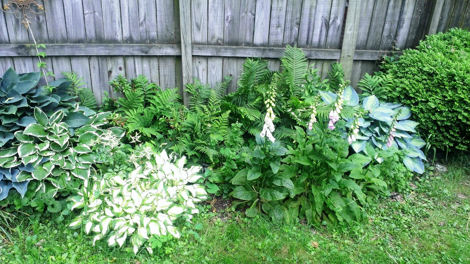 Our garden is mostly shady, very nice in the hot summer but not a lot of things like to grow there. here is a bed of hostas, ferns and foxgloves. The hostas and ferns seem to be locked in a death match to see who can choke the other out. I do have some primroses but they are under the crazed foliage.