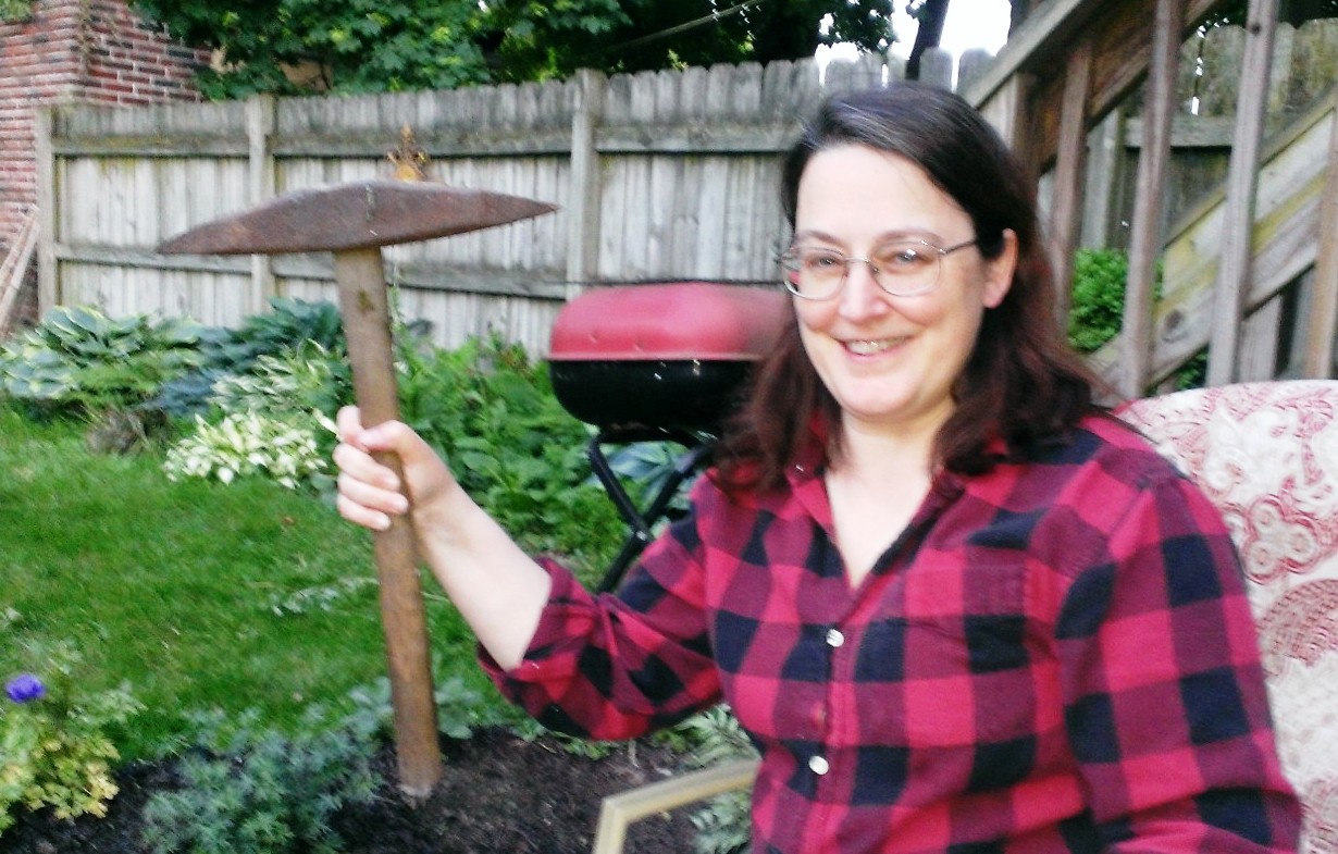 And, for those who are curious about what Vel looks like, a picture of very pale, very casual-looking me holding a rather curious tool I found on my folks’ farm. It’s a pick for mining coal in small very dangerous homemade mines that farmers had back in the early 20th and late 19th centuries. Of course, it would make a great weapon for your favorite dwarf! It weighs about 20 pounds, and it extremely pointy on both ends. We use it to break kindling.