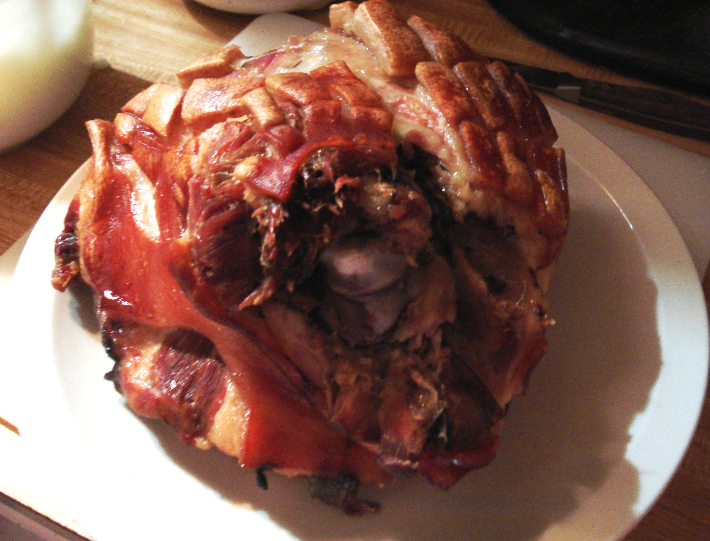 Since it was on sale ($1.49/pound) and we love it, I got a whole pork shoulder aka “fresh ham” aka a lot of other terms. In this cut you have no choice but to admit that meat does indeed come from animals since you’ve got the skin, bone and it’s quite recognizable as a leg. This one ran about 8 pounds, so this isn’t one of the big hogs I grew up with on the farm where their legs were probably double or triple the weight . All told, I got about 4 pounds of useable meat and fat from this beastie, the bones being quite large. You also lose weight when it comes to the skin. Some of the skin on this roast did crisp up into cracklings but the majority didn’t.
