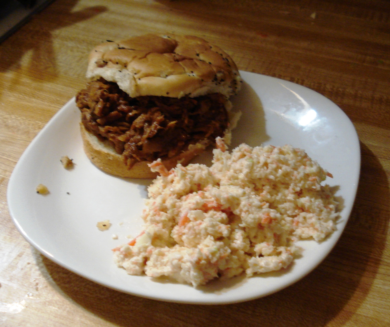 One meal was pork, gravy, and mashed potatoes (you can get an idea on how I make gravy and potatoes here). The rest of the pork was then cooled, and shredded for future use in barbeque pulled pork sandwiches and the infamous bao that have been discussed on this blog before. I consumed the cracklings, since my husband isn’t as fond of them as I am. These aren’t the fried pork rinds you can buy, which are deep fried and very light and crispy. These cracklings are hard crunchy, and occasionally a little too hard to eat.