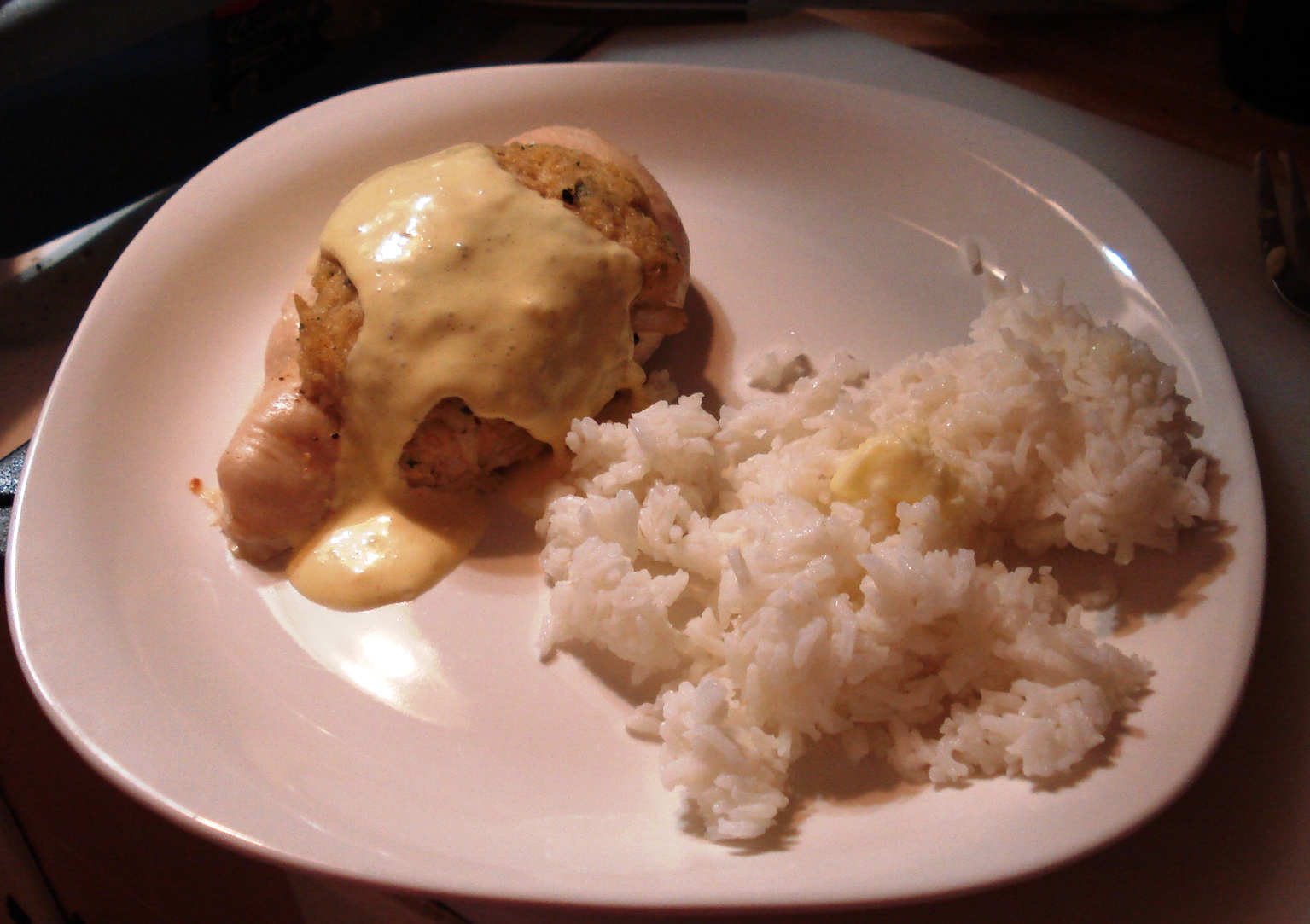 I also picked up a crab stuffed chicken breast at my new place of employment. It wasn’t terribly great, but expecting a plain boneless, skinless chicken breast with a crab cake perched on it to be anything wonderful is a little silly. Boneless, skinless chicken breast is *boring*. We did perk it up with a lemony hollandaise sauce. We used the Joy of Cooking’s blender hollandaise recipe. I just made a quick batch of white rice as a side. More brown/beige food! 🙂