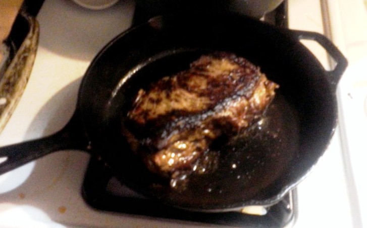 This lovely steak was cooked to perfection by my husband. We were going to grill out with our charcoal grill but decided to do the steak in the kitchen. We have a great cast iron pan from Lodge that is about 12” in diameter. We also have a gas stove that can get it very hot. Placing a couple of tablespoons of oil in the pan (canola or something with a high smoke point, please), my husband got it sizzling hot. He placed the steak in and then *let it alone*. After a few minutes, it had formed a black-brown crust on the side that was down and had loosened for flipping. He repeated this with each long side, then setting the steak on a plate to rest for 10 minutes. This made for the perfect medium-rare (pink/purple and warm in the center). The photos are blurry, but you can see what’s needed. We do need to get a new camera someday…. I hate to admit it but we had nothing else for that dinner. Except beer.