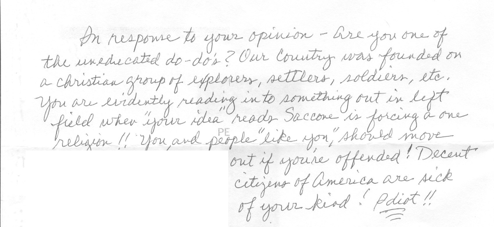 “In response to your opinion – Are you one of the uneducated do-do’s? Our Country was founded on a Christian group of explorers, settlers, soldiers, etc. You are evidently reading in to something out in left field when “your idea” reads Saccone is forcing a one religion!! You, and people “like you”, should move out if you’re offended! Decent citizens of America are sick of your kind! Idiot!!” (darn, that last word had *two* whole underlines 🙂 )