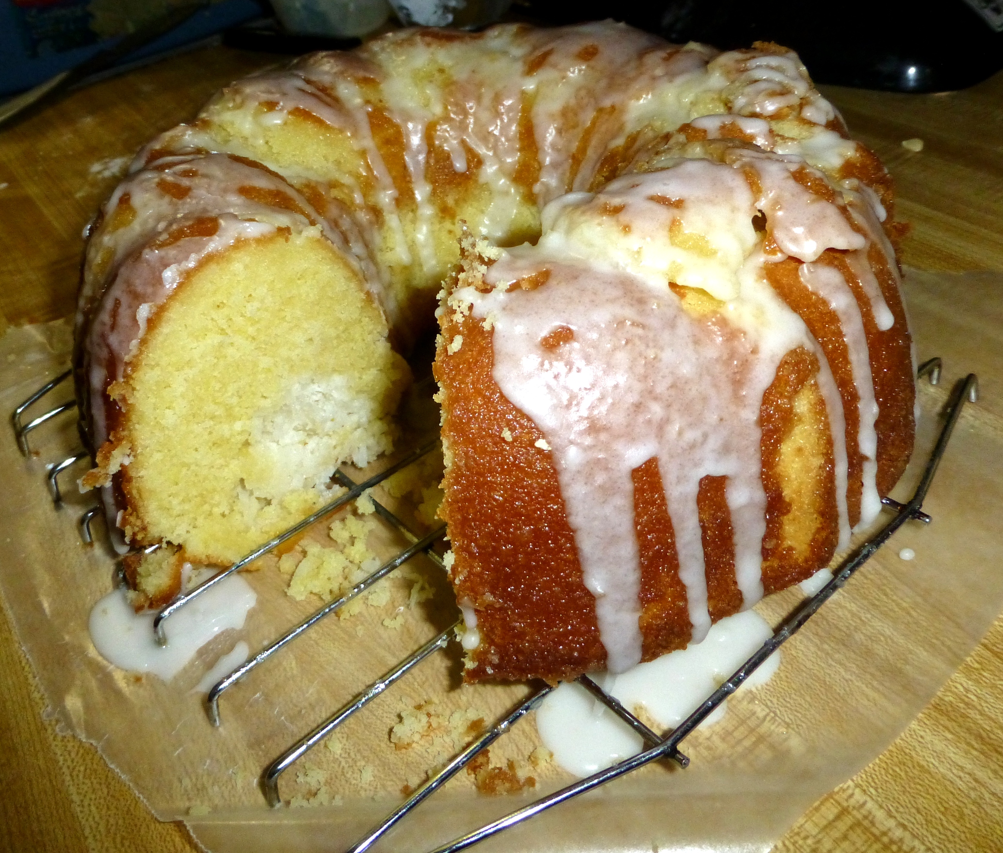 We’ve also made a bundt cake. I’m feeling so retro 🙂 It was the King Arthur Flour Co’s Lemon Bundt Cake with Coconut filling. I’m about 90% sure that this coconut filling is what I’ve been looking for these past years. At one point, there was a chocolate bundt cake mix with coconut filling that my husband I both could remember liking a lot. I tried it a couple of times and I could never get the consistency and flavor right. This *is* right. It’s not too sweet and has a nice soft texture. So, next time I make a cake, it’ll be a chocolate version of this. I would have never thought to use what amounts to a meringue inside a cake. The cake isn’t quite perfect since it’s pretty much inevitable that part of the top will stick and have to be scraped off the pan. But glaze can cover a lot of baking sins. I used about half of the “glaze” in the recipe to moisten the hot cake and added confectioner’s sugar to the rest to make the white glaze. The filling is also not centered but again, that is pretty much up to utter luck where it ends up.
