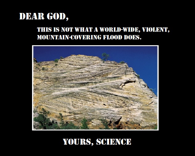 This is an amazing example of layers and cross-bedding, where the direction of the propelling force (in this case both wind and water) changed repeatedly over time, a lot longer than 40 days and 40 nights. This webpage is a very good overview of the stratigraphy of Zion National Park.