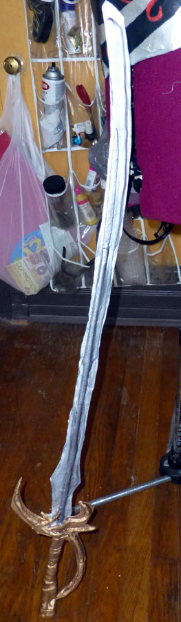 The sword was a estimated sketch from the drawing (taking scale into account from my measurements compared with the drawing). I cut out two layers of worbla and then stabilized the sword, and gave it some thickness, with more craft foam and a fiberglass rod (used to mark the end of driveways that I got from a home improvement store). The texture on the hilt is from taking strips of worbla, heating them and then rolling them like snakes to create more dimension. The hot worbla (you need asbestos hands for this), stuck to the flat layers.