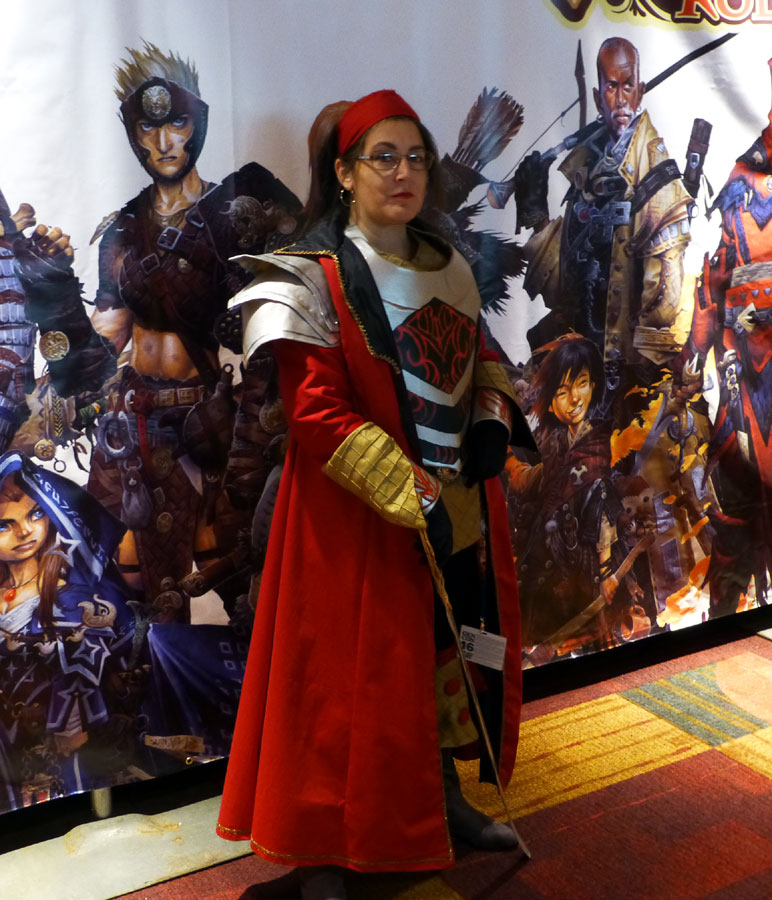 The red fabric is a stretch cotton sateen. I could have gone with all satin with this but again it would be so very shiny. I think really shiny works as a stage costume but for a hall costume, I think the sateen reads much more as “real” clothing. The various trims were left over from old projects from when I was doing the SCA thing. A very good place to get trims is at cheeptrims.com, though they only sell by the spool/bulk, not the yard. The gold fabric is windowpane pleated satin. Another tip: when searching for fabric, remember colors and textures interplay. A light brown satin will often read as “gold”, a dark gray velvet will read as almost black but give you some interest in your costume rather than going all “ninja”. So, if you’re looking for “gold” fabric, try some other search terms.