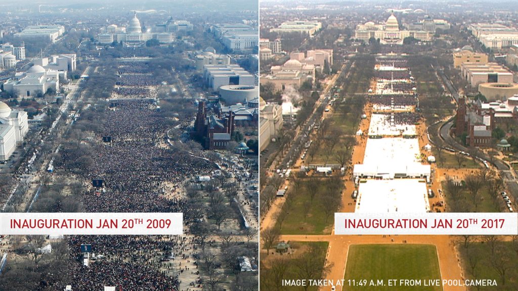 Then we get his mouthpiece, Kellyanne Conway, insisting on “alternative facts”. Sounds quite Orwellian, doesn’t it? The White House press secretary, Sean Spicer, went in front of the cameras and claims that “this was the largest audience to ever witness an inauguration, period”. This is of course a bald faced lie and we have lovely photographic evidence to show this wasn’t the case at all.
