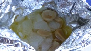 I made a loaf of bread, a pretty standard white loaf and we also put a foil packet of onions, garlic cloves and butter on the grill to cook. A nice red blend wine and what a fabulous meal!