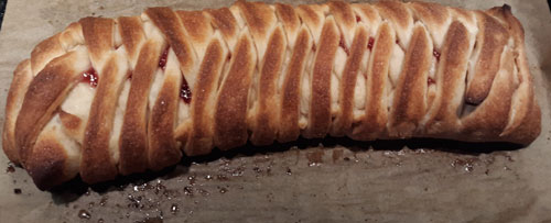 The technique is the same and you can use any filling you’d like. The dough comes in a rectangular sheet. Cut in a third from each side in one inch (2.5 cm) strips (a rolling pizza cutter works best). Put the filling in the center, cross the strips and pinch together the short ends to keep the filling in place. Bake at 400 degrees F (roughly 200 degrees C) for twenty minutes. We put them on baking parchment paper on a cookie sheet.