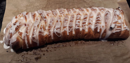 The second was a cherry cream cheese Danish-oid thing. The filling was half a can of cherry pie filling, and half a block of cream cheese. The cheese was on the outer long edges to corral the pie filling. He brushed the bottom of the crust with butter to get it nice and brown and brushed the top of the crust with butter, sanding it with sugar. We also added a basic glaze of confectioner’s sugar (fine sugar with cornstarch) and milk.