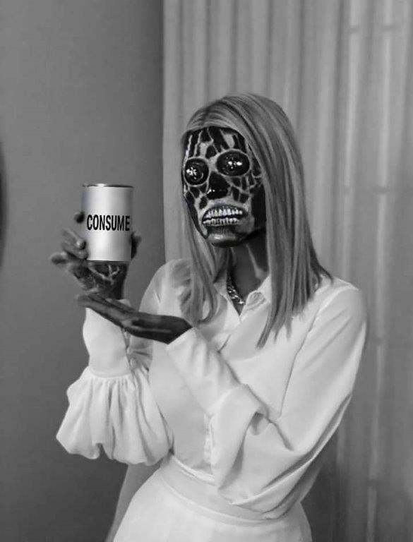 This imagery is from They Live, a John Carpenter movie from 1988. It is about an anyman, played by Roddy Piper (yes the wrestler), and him dealing with aliens who are corrupting humanity. Considering how inhumane the Trumps are, thinking that they are aliens isn’t the most strange thing.
