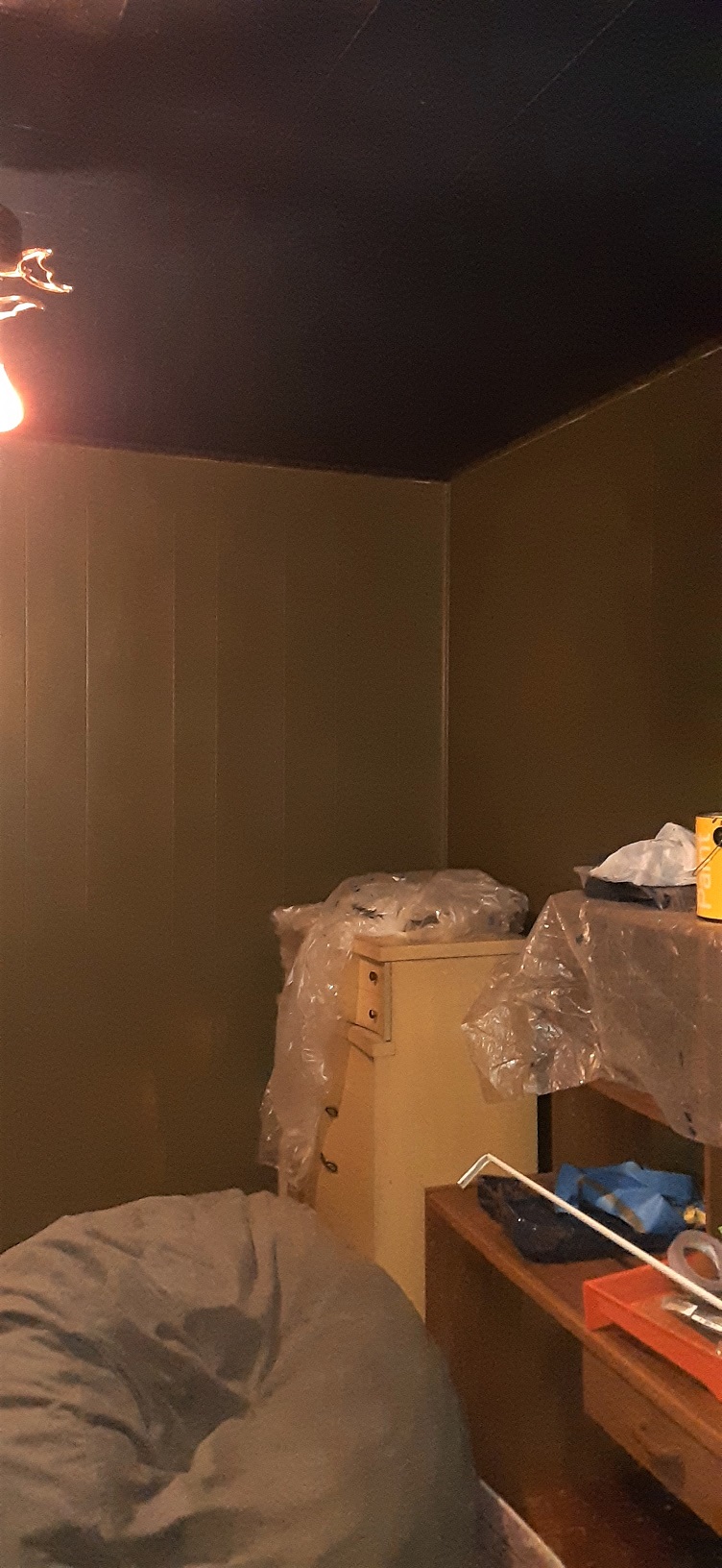 It looks a bit dark since we had some flame light bulbs in the ceiling fan to see how it would look. And there’s our monster gray beanbag. The 60’s dresser will be repurposed somewhere else in the house and the DIY computer desk will be removed. In its place will be an electric fireplace (happily the heat and fake flames are seperate so I can have the flames whenever I want them):