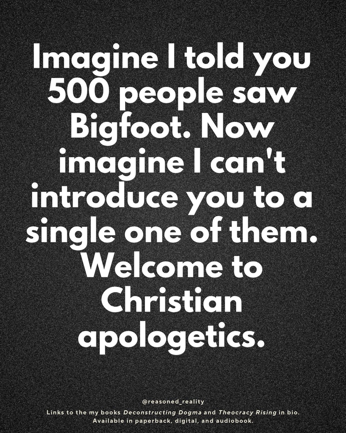 Apologetics is constructing up arguments to defend Bigfoot even though no one you know has ever seen him lol.