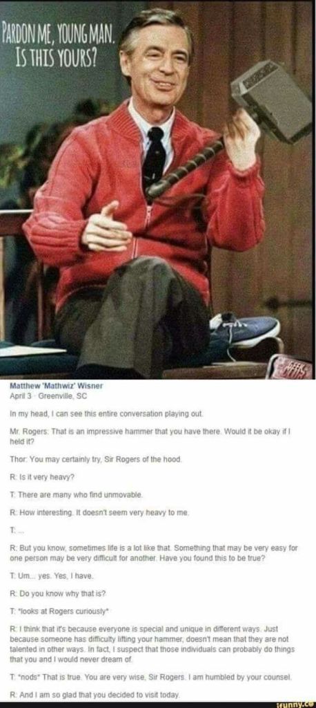 I love that Fred Rogers is holding Thor’s hammer! (For those who don’t know, it’s from Marvel movies Thor.) Because Mr Rogers is the embodiment of good. 😉