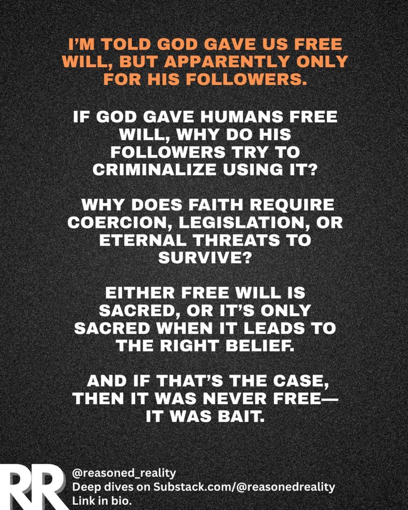 it’s notable how blind she is to her own argument’s failures, and all her claims depend on a presupposition: her god exists and agrees with her. She says this “Each group is just following the rules its leader selected and enforces, after all.” and curious how each group of christians does exactly that, sure that only they know what their imaginary friend really wants.