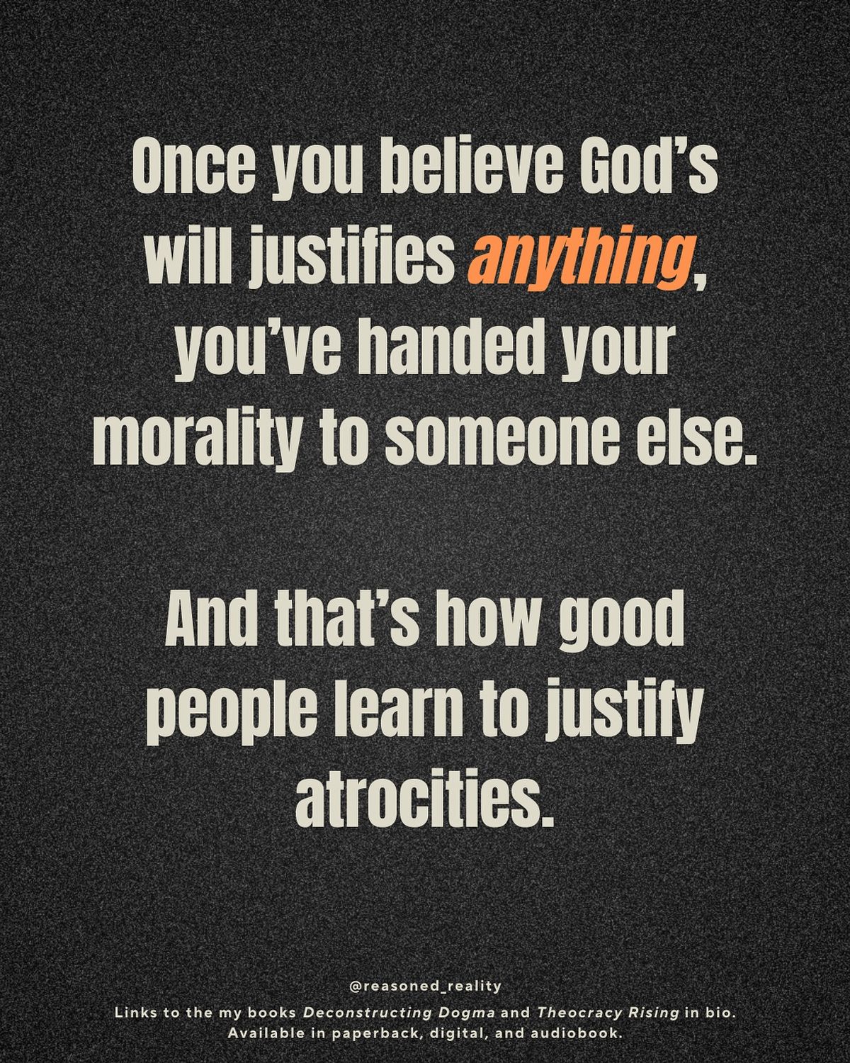 They also have the problem that they must insist that their god doesn’t have to follow these supposedly “objective” morals since they have to invent excuses why it is okay for this god to commit genocide, to kill people for the actions of others, etc. This makes their morality subjective to who someone is. it also shows their morality is little more than might equals right.